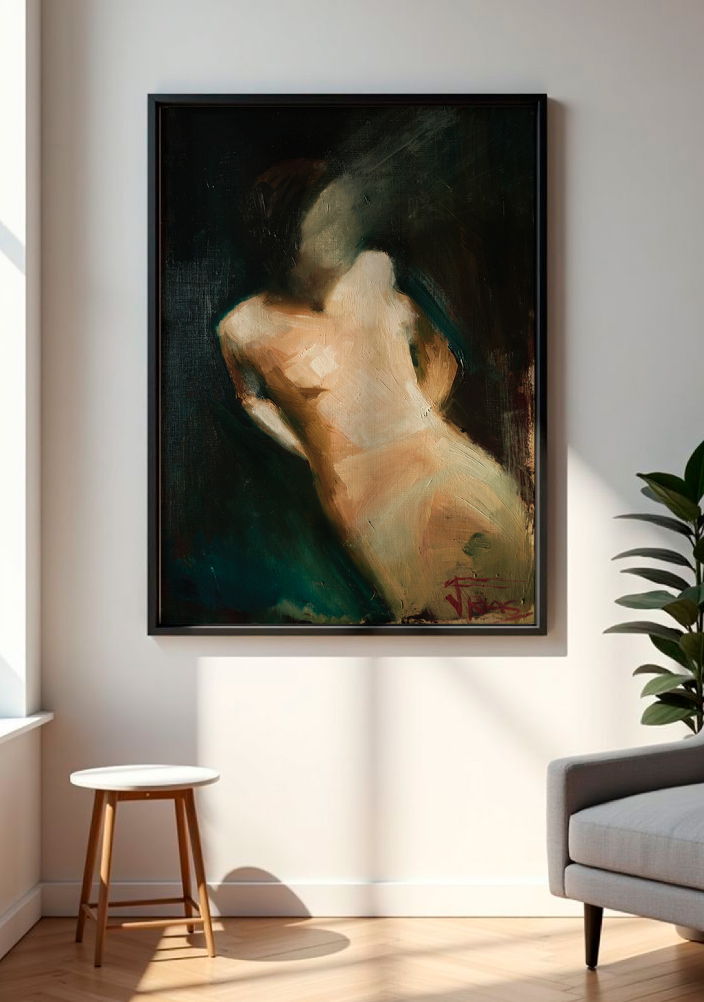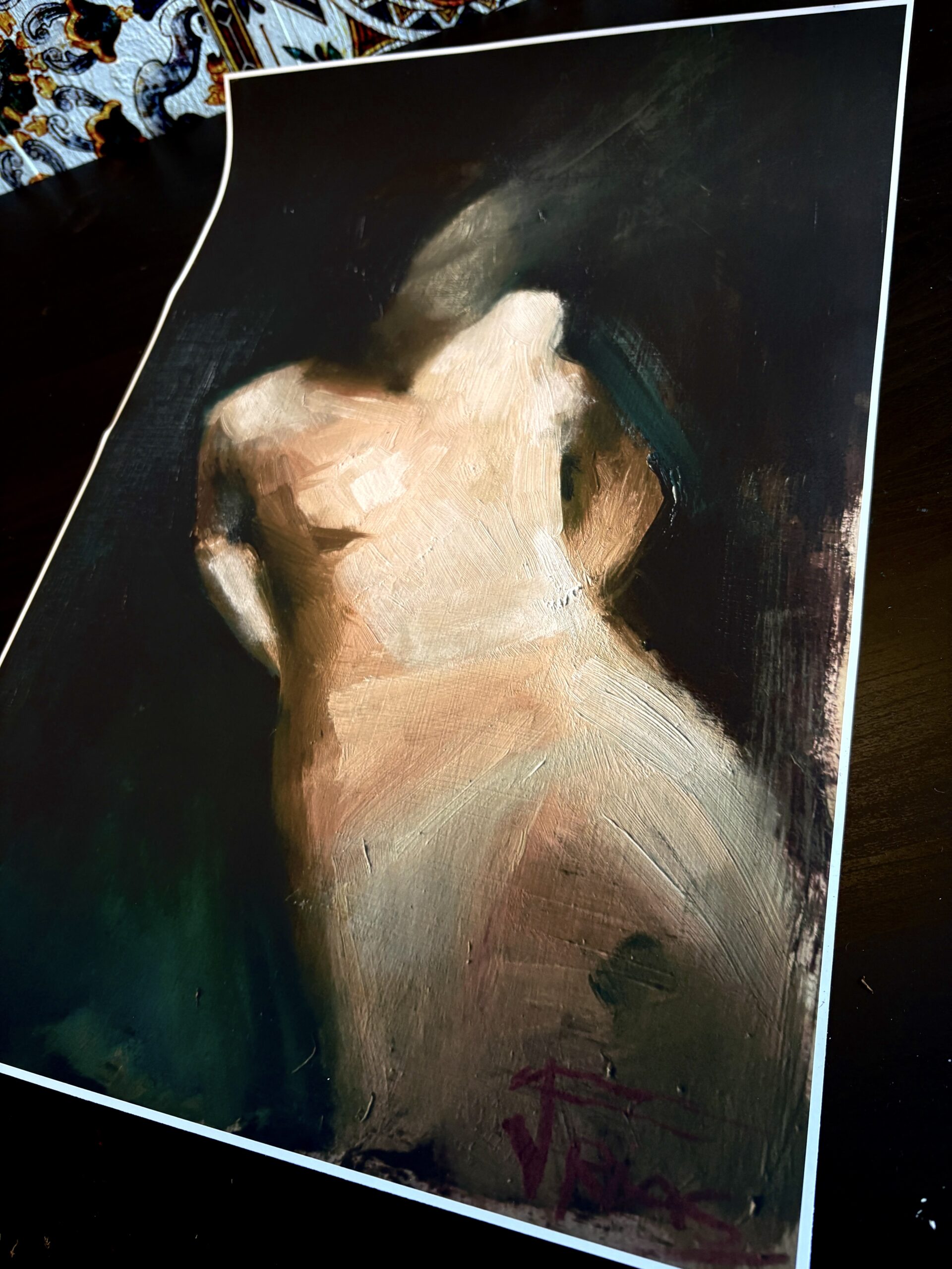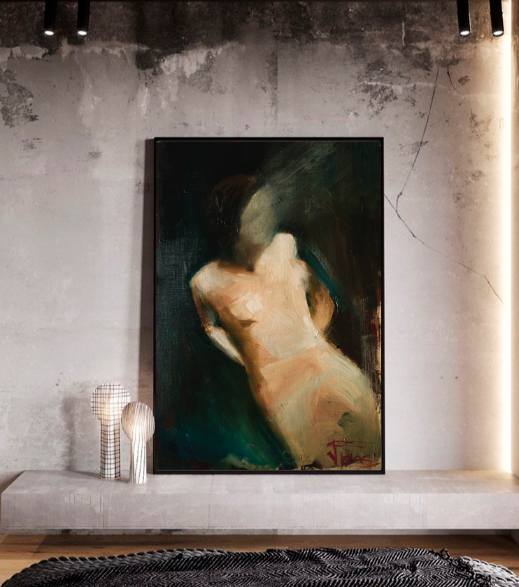 “Fade Away” captures the moment when the human form dissolves between light and shadow — a gesture of vulnerability and silence. The loose brushwork and deep oil textures invite the viewer to see the body not as a portrait, but as an emotion suspended in time.